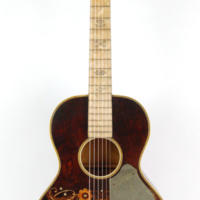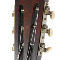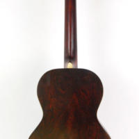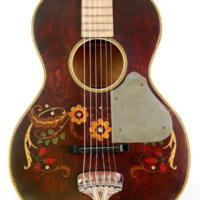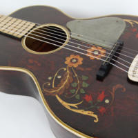 About as decorative as you can get with a guitar. Concert sized all birch construction with all of the Oscar Schmidt construction traits. First guitar I bought and quickly found that I wasn’t game to make it into a better playing guitar for fear of decreasing its value, so I resold it. Mother of toilet seat fret board and an original fancy reflective pick guard, edged in a gold sparkle material, makes this Stella a show pony.