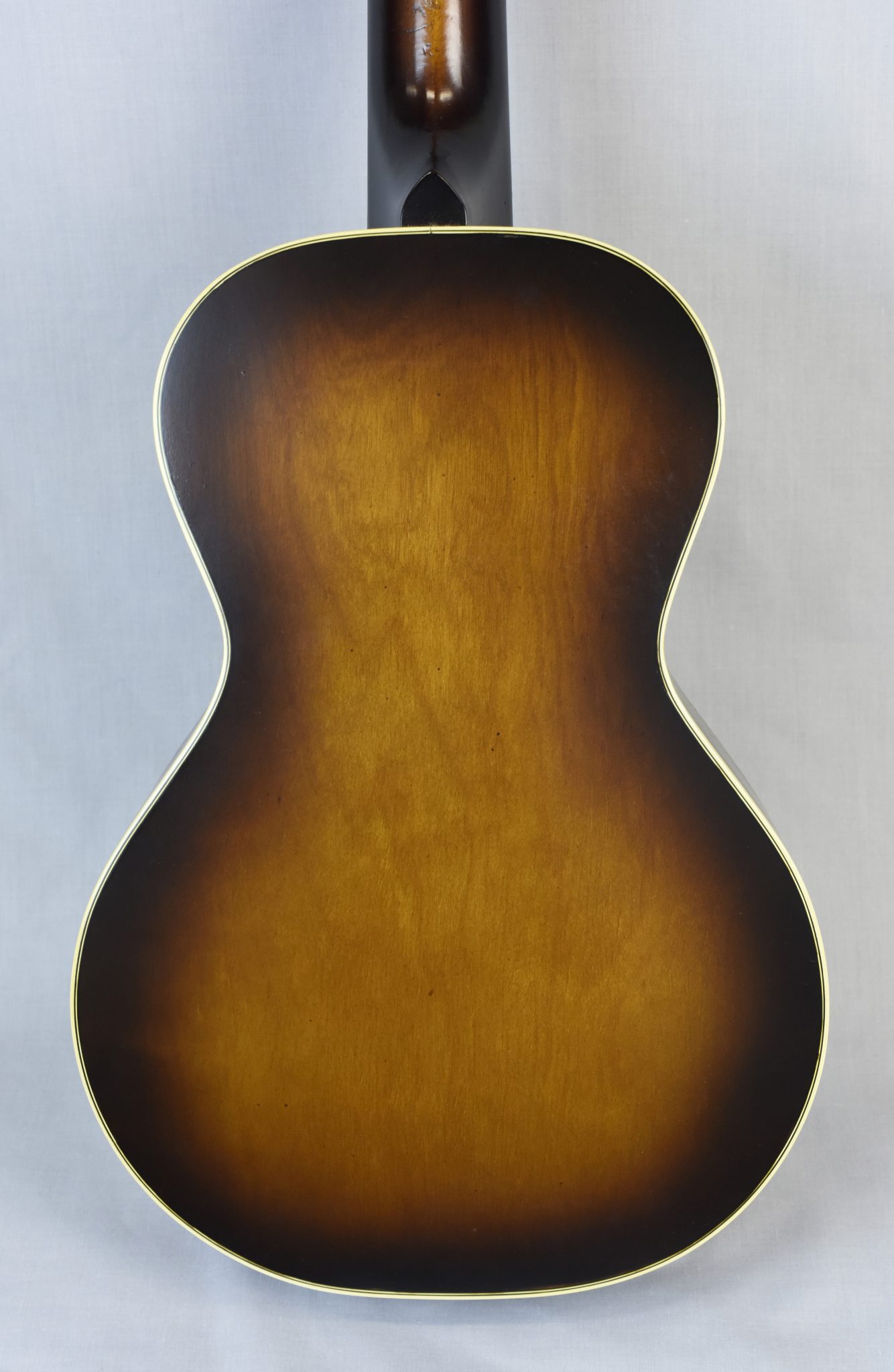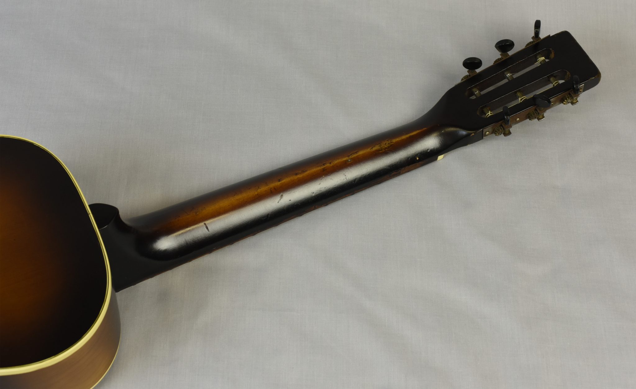 It is only 34 ¼” (87cms) total length and it has a 21 ¾“ scale. It is an unusually small size and here it is compared to a regular Weymann ‘parlor’ guitar, total length 37” (94cms).