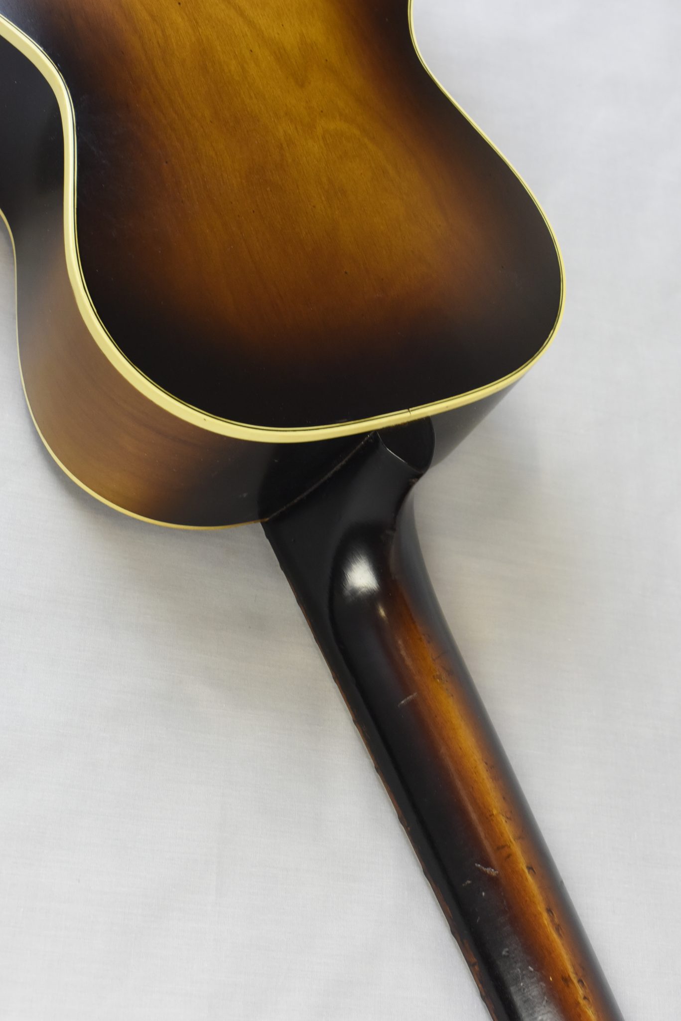 With the reasonable degree of workmanship, it has a spruce top and birch back and sides, with celluloid on the top and back edges. Also 14 frets above the body and floral decoration that is either decal (decalcomania) or silk screened. I’d say the guitar dates to about 1940. (See this post for information about decalcomania).
