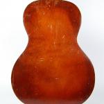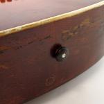 From the Vintage Blues Guitars description: “This example (of a First Hawaiian Conservatory Birch guitar) is pretty much all original. When we received it, the gold instructional paper was still on the fingerboard. The body is birch, stained orange. The neck is poplar and the fingerboard is maple, now dyed black. The four position markers were under the paper. The top and sound hole are bound in white celluloid. The end pins are likely maple with pearl dots on top, and are original to the guitar (one looks like an old replacement). The bridge is maple painted black. The end pin is missing.