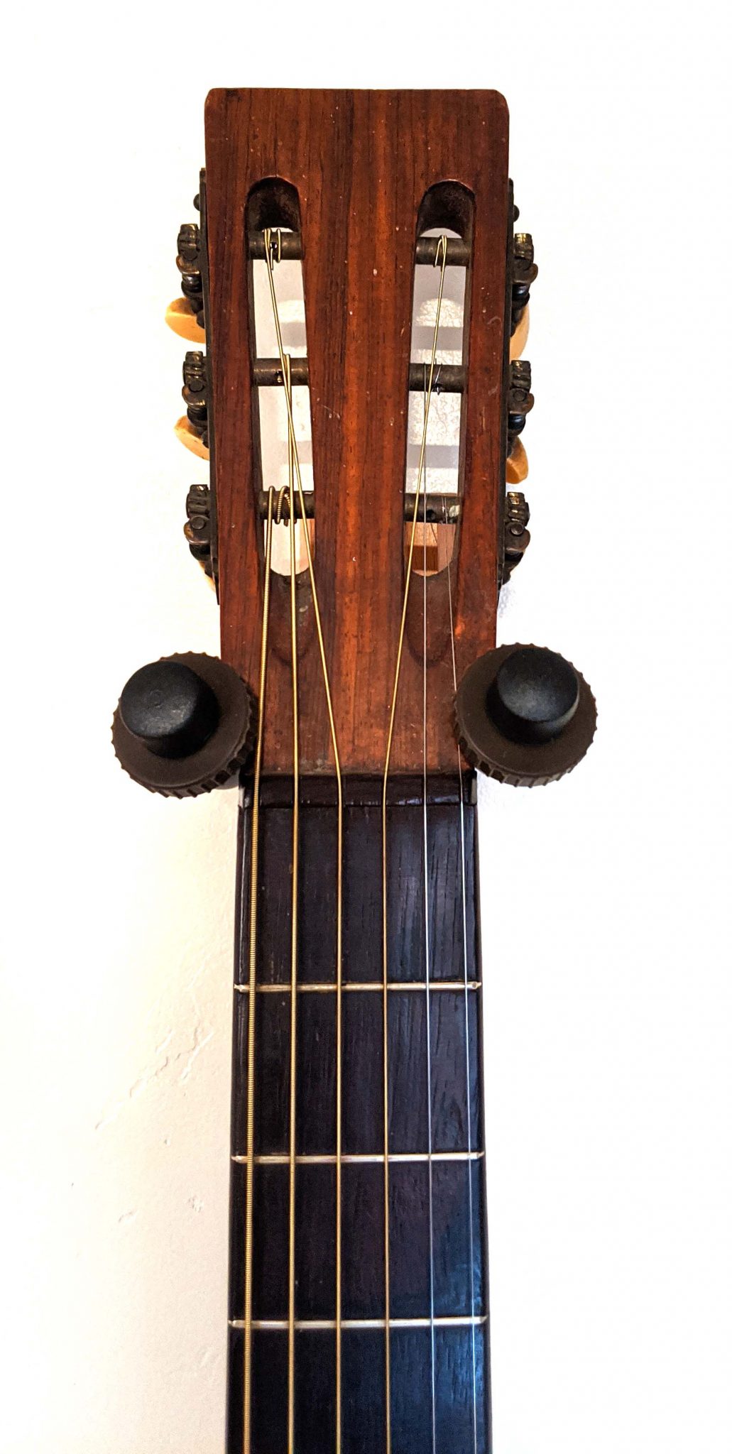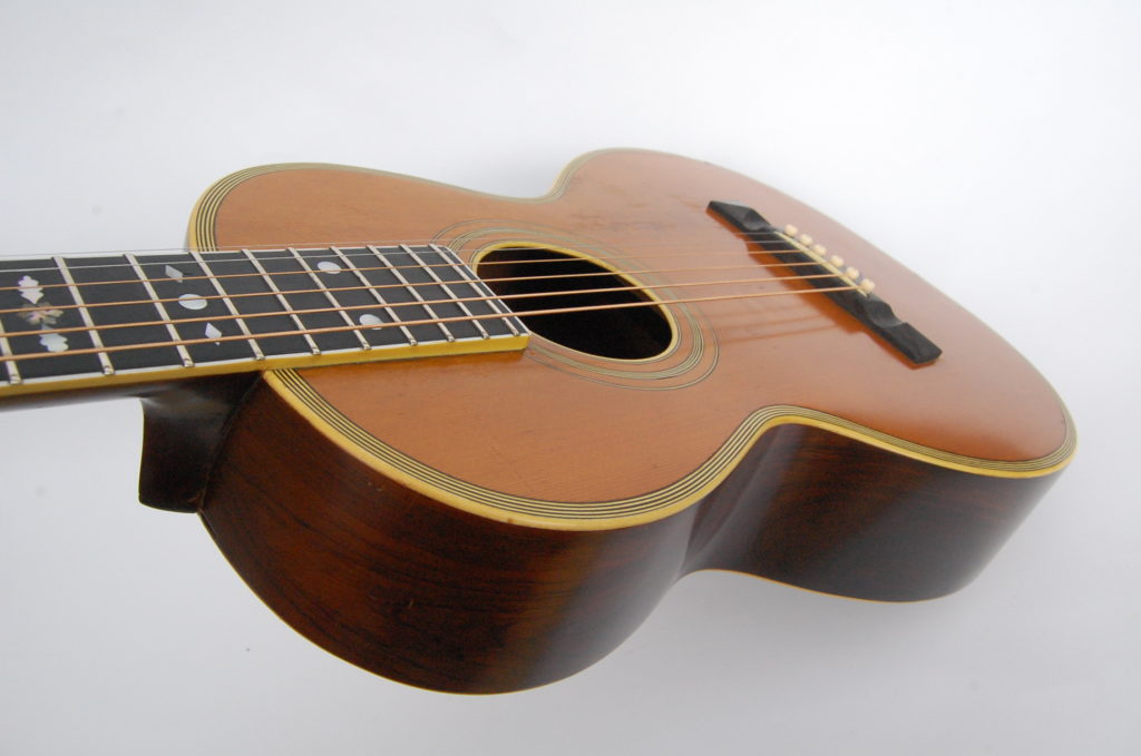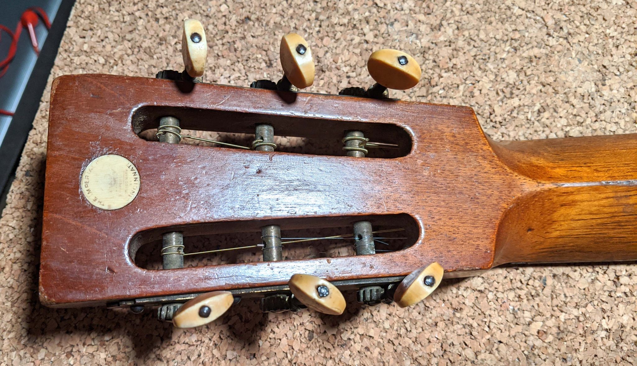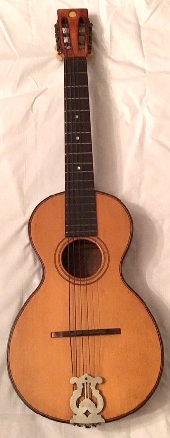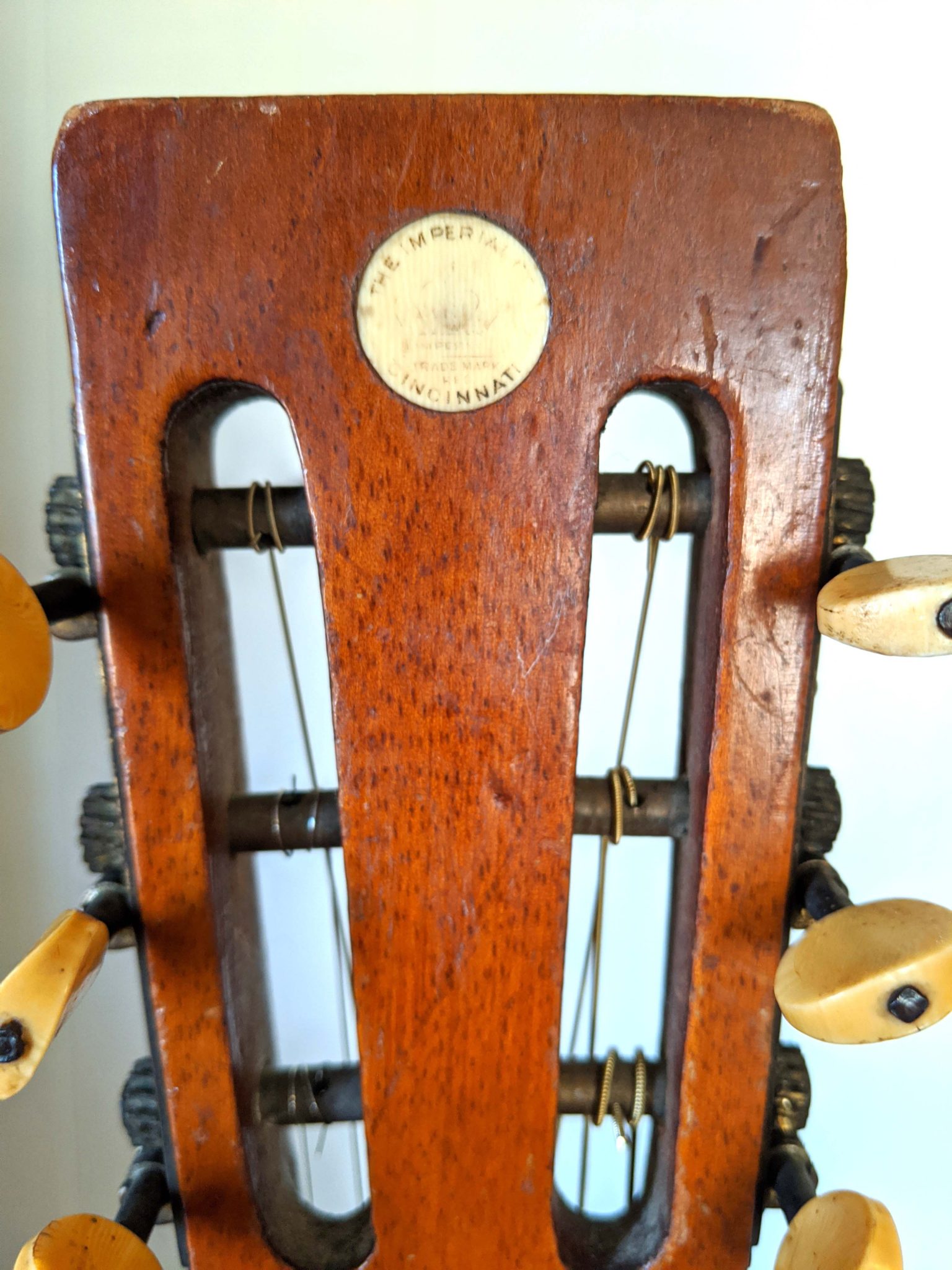 I have been playing the Imperial guitar I renovated for weeks now. It has become my go-to guitar even though the fretboard/nut is narrower than I prefer. The sound is what keeps drawing me back. When I completed the renovation, I installed Aquila romantic guitar nylgut strings on it. (I was concerned about putting any kind of steel string on the guitar due to its age and ladder bracing.) I can’t describe the sound except that it is lovely and rich. Of course, those two adjectives mean different things to different people, but the tone is unlike any other guitar I have played. It won’t cut through with more than two or three other instruments, but it will definitely more than hold its own as a small room, parlor guitar. I play it only in a finger picking style and don’t strum chords. It fills my reading room with almost a liquid sound. I am glad you encouraged me to restore what I had, and my greatest hope is that one of my grandchildren will want to learn to play it. (Two of them are already taking ukulele lessons. I have hope.) Thanks for you website. Also, I never found a serial number on it anywhere. Strange. Rex Reed, Dayton, Nevada, USA