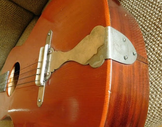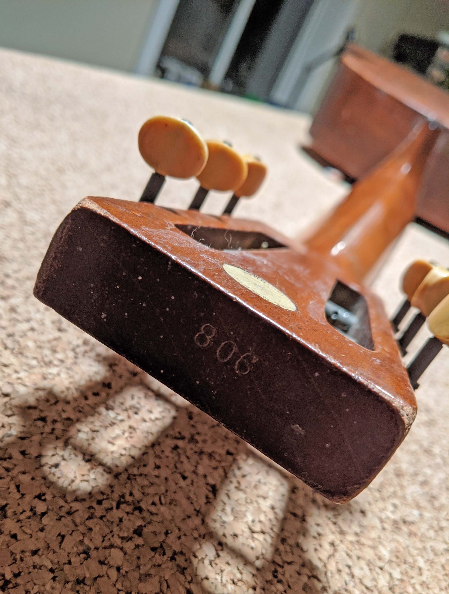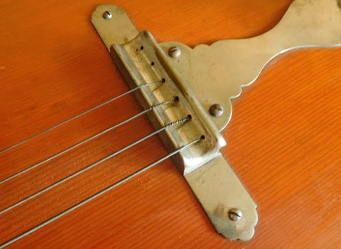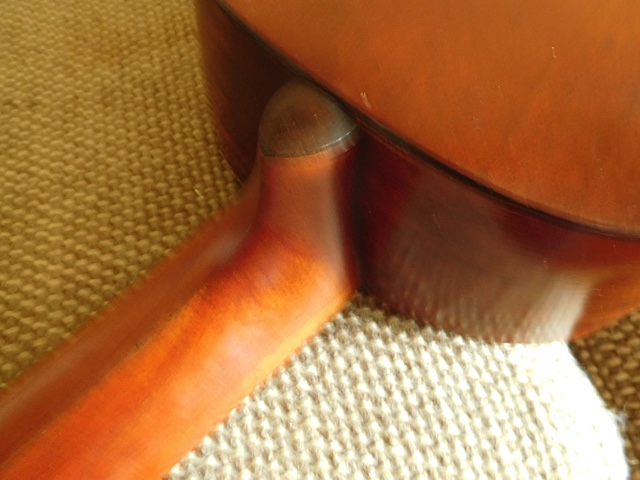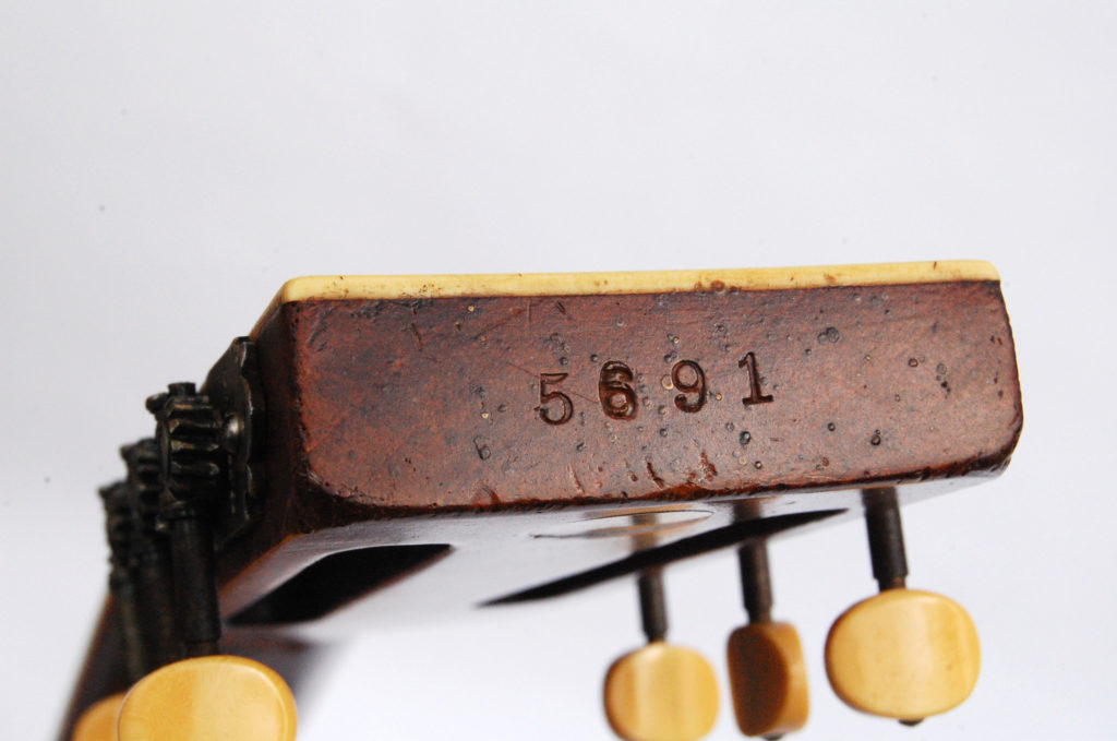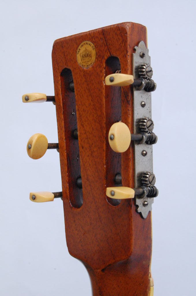 Notice the round inlaid ‘button’ on the back of the headstock with the ‘Imperial’ name on it which I think is ivory. The ebony pyramid bridge is a handmade replacement