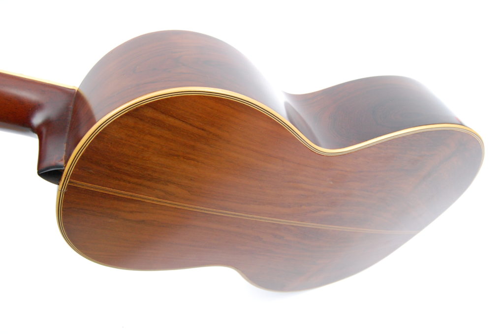 Another Imperial guitar is one that I have been able to examine closely as it was restored by my good friend Matt from Matt’s Guitar Service. It has a fine grained Adirondack spruce top with very beautiful Brazilian rosewood back and sides. It plays and sounds exquisite! The tortoise shell under the bridge does not seem original but was added many years ago.