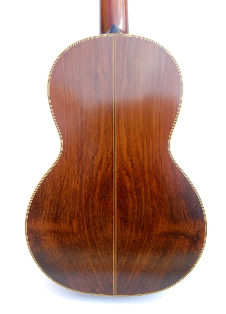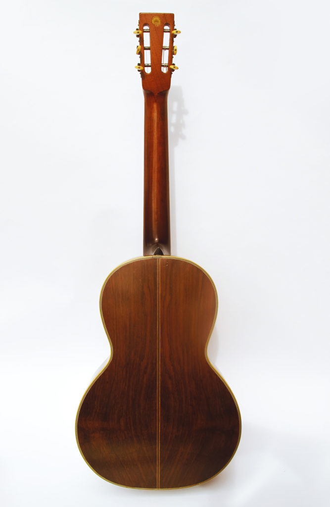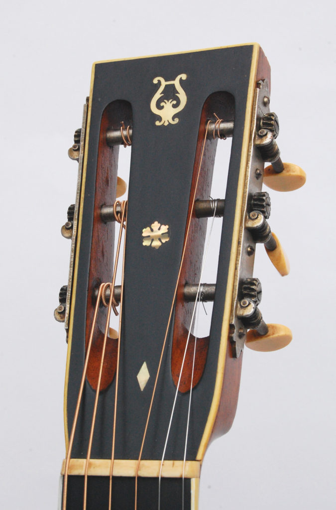 Thank you for this Imperial site. I have only seen three and one I own. When I took the guitar in for restoration, we discovered that mine has a 27″ scale, which makes it a baritone! Someone had done a poor restoration years before and so we were very careful with the subsequent restoration. Every luthier who has played the guitar couldn’t put the guitar down. Full 15″ lower bout, spruce over Brazilian, 12 frets to the body. Heavenly. I can do a harmonic on the 12th fret, put the guitar down, go grad a cup of coffee and the guitar is still resonating. Mine has the medallion on the back of the headstock, however the previous restoration apparently sanded off the numbers.