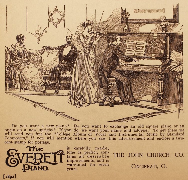 The John Church Co sold Everett pianos which was functionally a wholly owned subsidiary. They were also the largest music publishing house in Ohio and one of the largest in the United States. As well as being based in Cincinnati and Leipsic in Ohio they had offices in New York and Chicago.