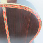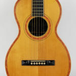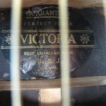 Listed as Style 283, it has a faux painted rosewood finish over maple back and sides.  The finish was never meant to mislead anyone and it is more stylized than realistic. Beautiful red purfling front and back, I would expect very few of this model survived in this condition.  It still has the original ‘Victoria’ paper label inside and also the ‘Victoria’ crown decal on the back of the headstock in mint condition.