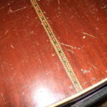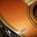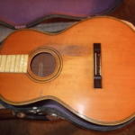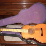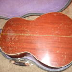 This is the top of Weymann’s guitar styles, and is 14 ½” wide with mahogany back and sides with elaborate marquetry on the spruce top. It has a pearloid (mother-of-toilet-seat) fingerboard, and banjo tuners recessed into the pearloid-faced headstock.  It is a 12-fret guitar with X-bracing that is setup for steel strings.